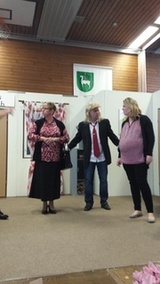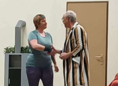 Der zweite Teil des Abends war brillant gefüllt mit einer Theateraufführung. Die Regie für die Komödie „Eine märchenhafte Vereinsfeier“ führte Volker Blankenhorn. Der Vorstand eines fiktiven Vereins möchte die bevorstehende übliche Vereinsfeier einmal mit neuem Wind füllen und kreiert ein Märchen mit Drache, Hexe, Zwerg, edlem Ritter, Knappe, anmutiger Fee, einem sprechenden Baum und einem fast verzweifelnden Märchenerzähler. Die Probe verläuft noch nach Plan, die Aufführung jedoch leicht aus dem „Ruder“. Aber am Ende „finden sich alle“ und die Welt ist wieder in Ordnung. Das Publikum hat Tränen gelacht, ist begeistert und beschenkt die Schauspieler mit einem lang anhaltenden Applaus. Die schauspielerischen Leistungen der Darsteller Volker Blankenhorn, Achim Haußmann, Karl-Heinz Hiller, Gabi Mellert, Helmut Mellert, Silke Treuer und Heike Weinmann waren wieder einmal beeindruckend. Ihnen hat man die Freude am Schauspielen angemerkt. Unterstützt wurden die Schauspieler durch Barbara Haußmann (Souffleuse), Salon Andreas und Carmen Schuhmacher (Maske) und Lydia Haussmann („Nummerngirl“). Mit Rosen und Wein bedankte sich der Vorstand bei den Theaterschauspielern.